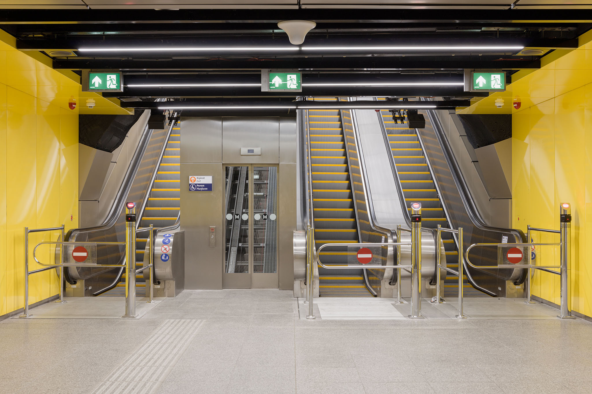 The design of the station’s new architectural concept and the artistic surfaces were mostly defined by the location and the above-ground building. Among the attributes, transformation, and ongoing changes of the historical site, the most prominent permanent element is the nearby green oasis Füvészkert, whose original boundary was situaed along Szigony Street. Another defining element was the building itself, which carries the characteristics of Brutalist architecture with its considerable sense of mass and puritanism. The new concept incorporates a yellow colour that refers back to the original design and pairs it with vegetation, reminiscent of Brutalist buildings. This combination, along withthe playful organic plant symbols, counterbalances the coolness of form andmaterial, creating a pleasant atmosphere that softens the industrial environment dictated by its function. They fit well with the surrounding healthcare infrastructure: they radiate peace and calmness for those seeking healing.